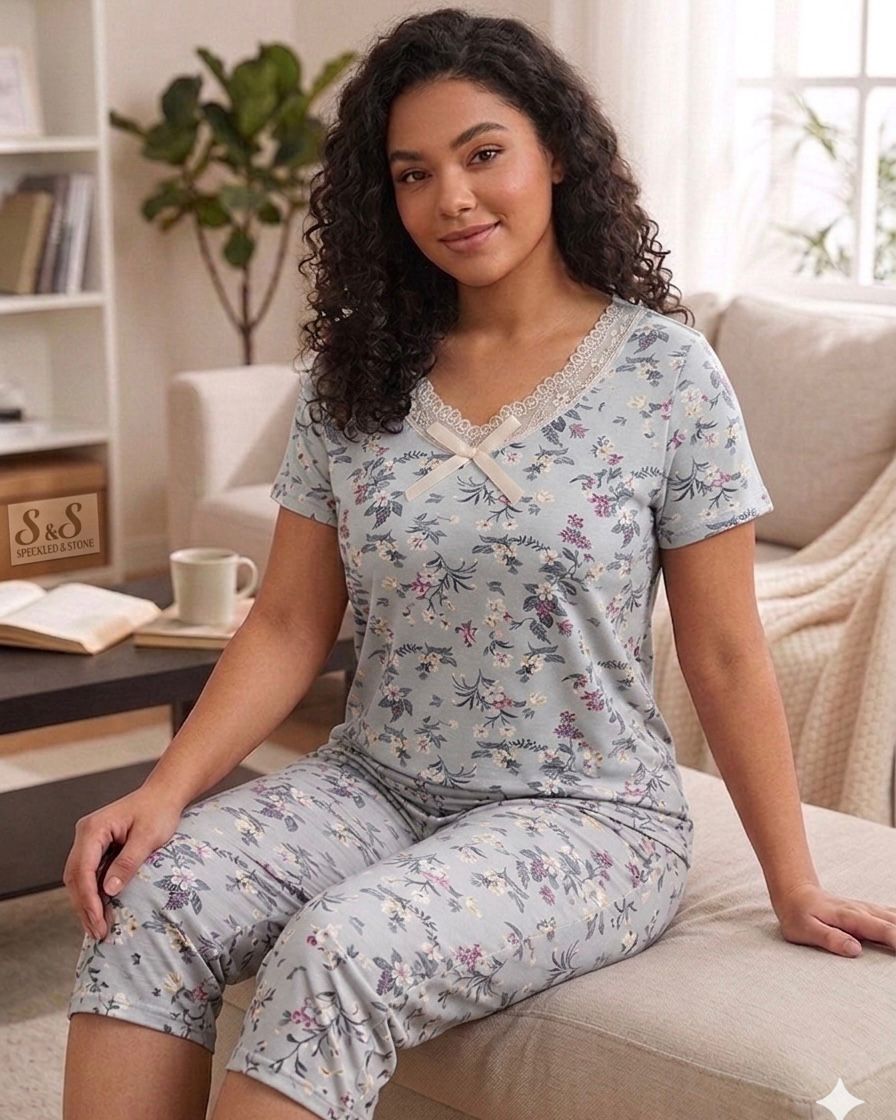 Ova ženska pidžama s kratkim rukavima i tri-četvrt pantalonama je izrađena od visokokvalitetne viskoze, ova pidžama nudi mekanu, prozračnu i lagano rastezljivu tkaninu koja će vam pružiti osjećaj udobnosti tijekom cijele noći.